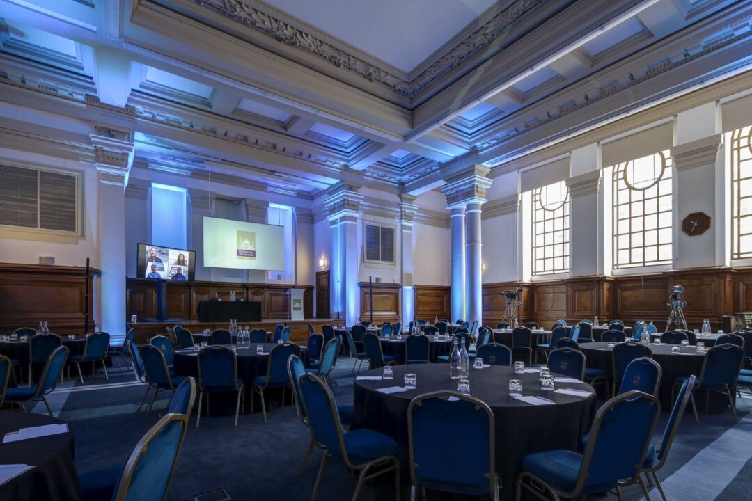 Our flagship space, the Great Hall, has hosted a plethora of conferences and events over the years, from the Infected Blood Inquiry to the Marvels of Saudi Arabia musical concert and even The Late, Late Show with James Corden. Its brilliantly designed stage area and excellent acoustics create an intimate atmosphere, whilst the unique period features are certain to make an impression from the moment you enter the room. This versatile conference space can host over 2,000 guests, supported by several breakout spaces including George Thomas, Robert Perks, and the Syndicate Rooms.