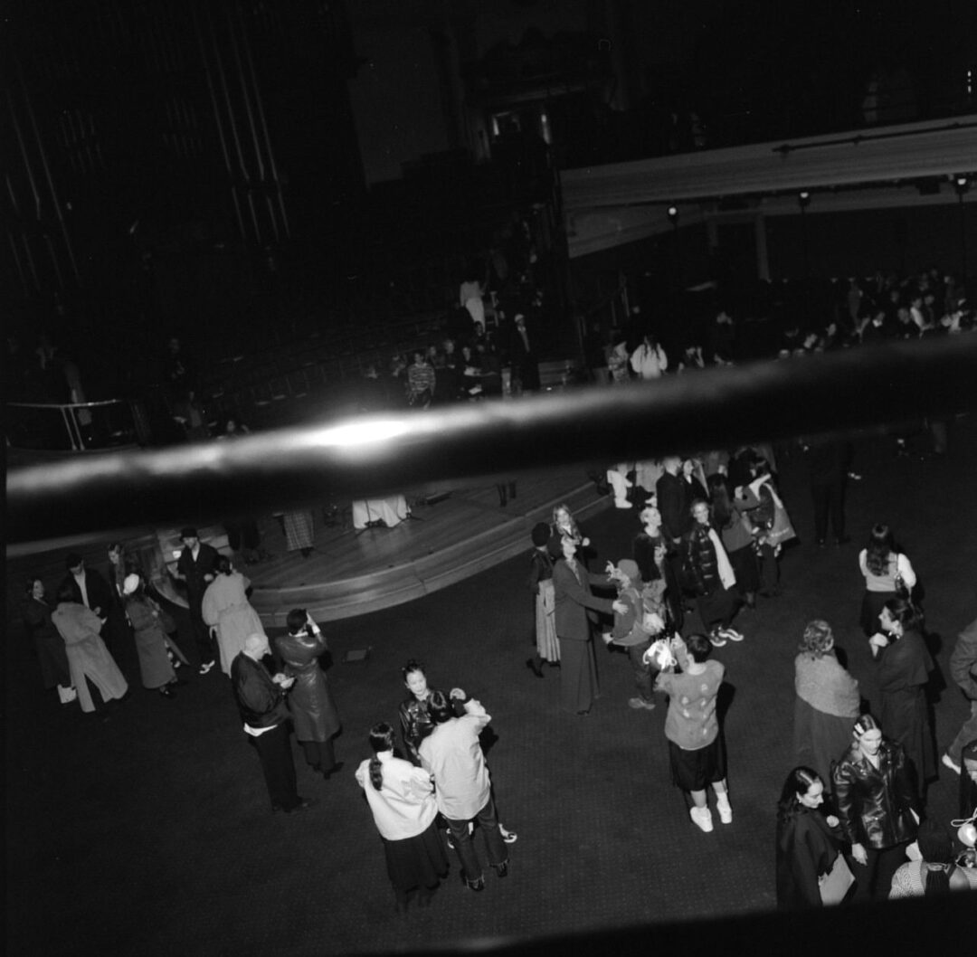 Simone Rocha’s A/W 23/24 show took advantage of the Great Hall’s dome ceiling and red carpet to match the model’s red ribbon tears. Guests were seated across two levels and enjoyed a performance by Irish folk group Lankum before a live set on the grand organ and whilst the models circled the space dressed in leather, lace, bows and pearls.